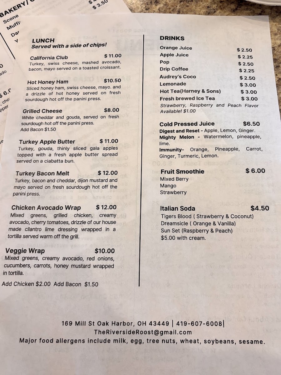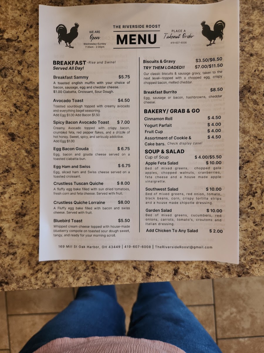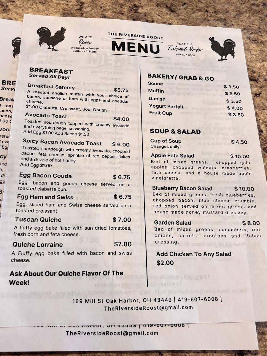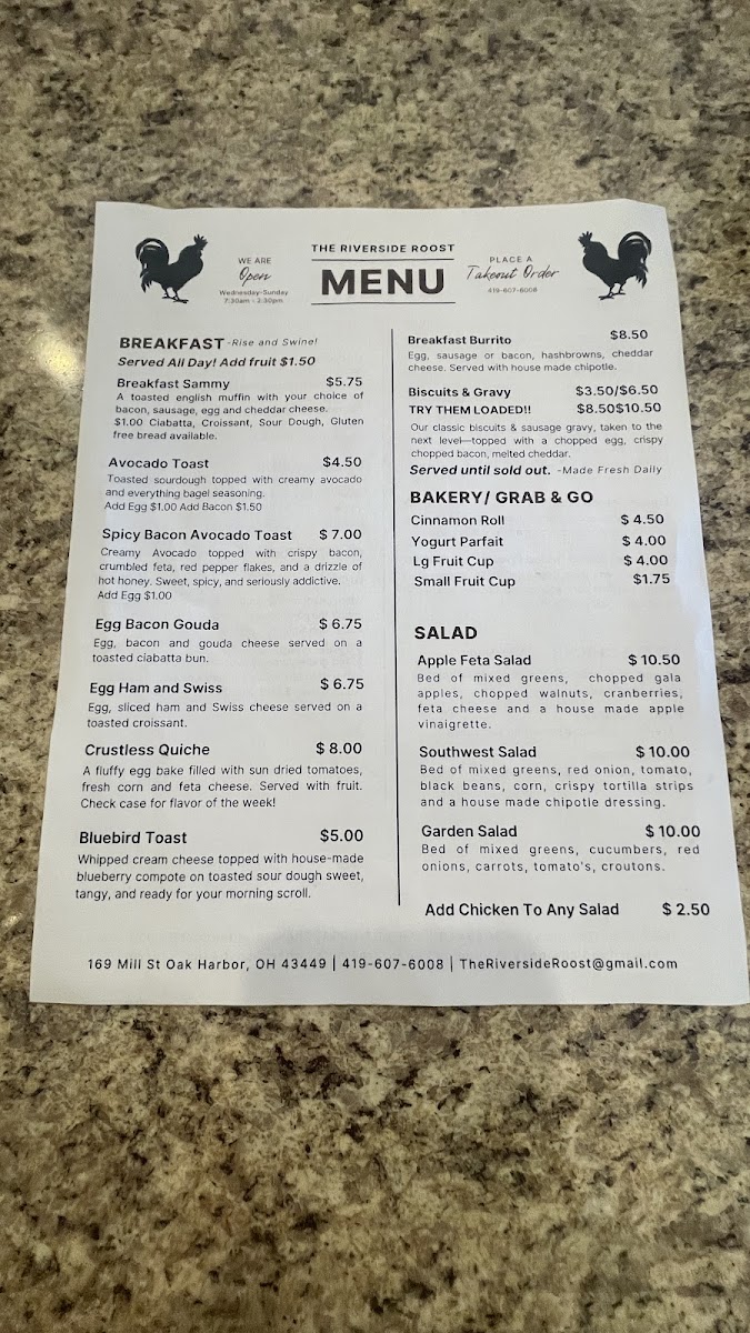 Welcome to The Riverside Roost, a charming café nestled at 169 Mill St, Oak Harbor, OH. The café boasts a warm atmosphere, perfect for both cozy indoor dining and picturesque outdoor seating overlooking the river. Their menu is a delightful mix of flavors that cater to breakfast and lunch enthusiasts alike.